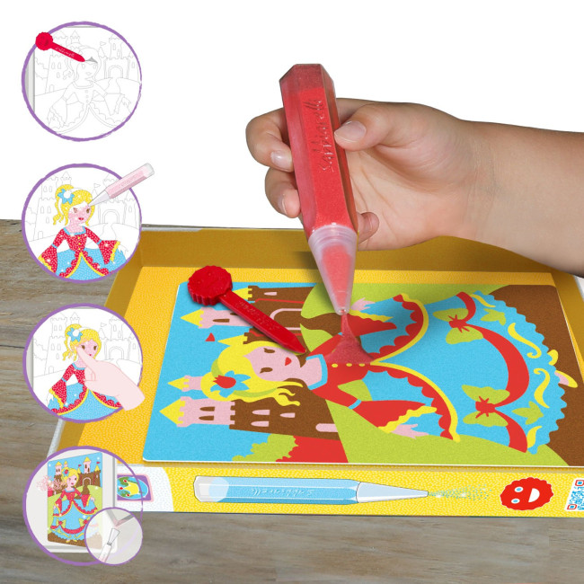 Grazie alle speciali penne Sabbiarelli, colorare con la sabbia è un'azione alla portata di tutti: i piccoli artisti possono liberare la loro creatività nella colorazione, seguendo l'esempio colore o scegliendo nuove combinazioni o ancora creando nuove sfumatore di colore mischiando tra loro le sabbie, senza sprechi.