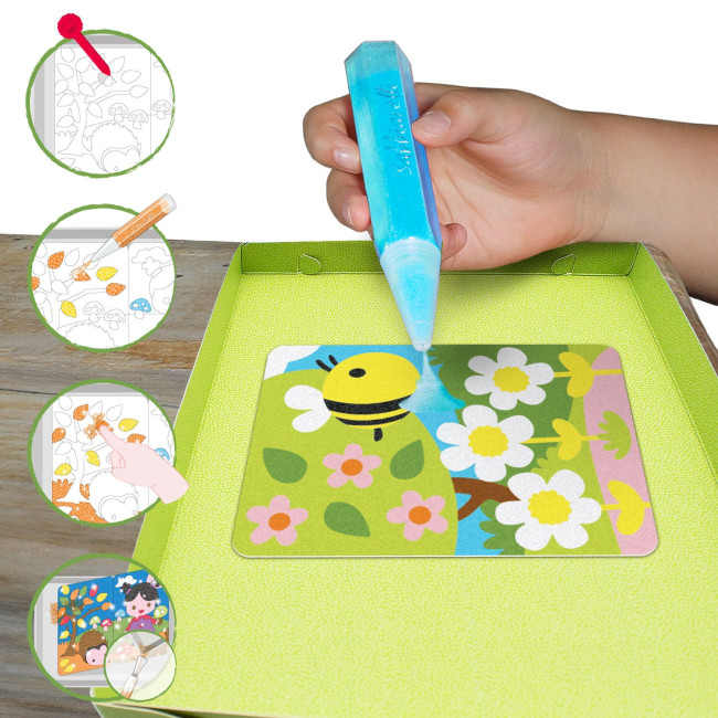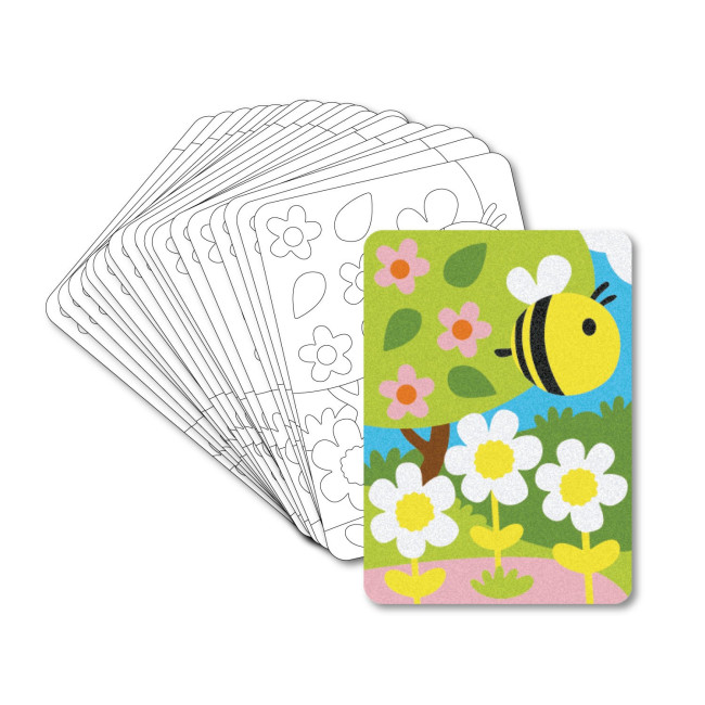 Il multipack contiene 10 fogli (15x20cm) pretagliati su carta adesiva con 20 disegni che raffigurano la stagione della Primavera, pronti per essere colorati con la sabbia. Non servono né forbici, né colla: rimuovendo la carta dal disegno rimane la superficie adesiva da colorare con le sabbie Sabbiarelli® (sabbia non inclusa)