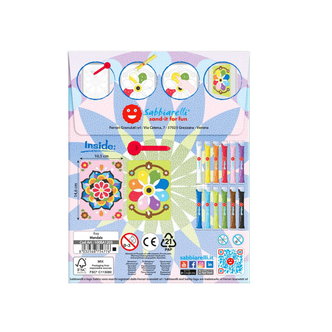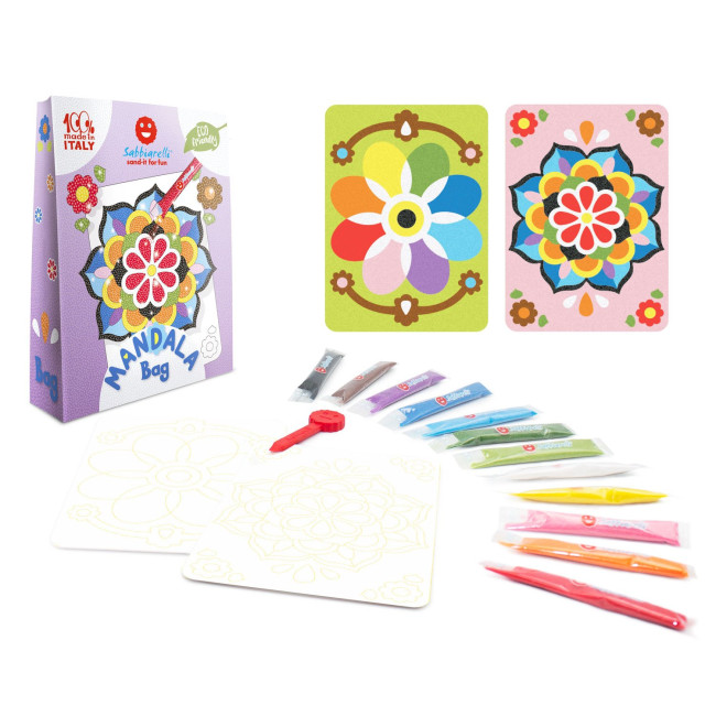 La Bag Sabbiarelli "Mandala" contiene 2 disegni adesivi a tema mandala, uno spellicolino e 12 bustine di sabbia di marmo scintillante, colorata con colori a base d'acqua, atossici ed ecologici. Questo mini kit a forma di bustina rappresenta la soluzione perfetta per chi vuole conoscere il gioco del sand painting e testarlo, prima di acquistare un kit con le penne. Per realizzare la base di gioco, suggeriamo di recuperare il coperchio di una scatola delle scarpe o anche solo un foglio A4. Appoggiato uno dei due disegni su questa base di gioco, con lo spellicolino ci si aiuta nel rimuovere i pezzetti di disegno che si vogliono colorare di uno stesso colore. A questo punto si apre la bustina del colore desiderato e la si versa sulle parti adesive del disegno, poi si fissa la sabbia con le dita e si scrolla la sabbia in eccesso, che può esser raccolta in un vasetto. E si procede così, un colore alla volta, fino a colorare tutto il disegno. Alla fine si otterranno due scintillanti quadretti con i mandala, pronti per essere appesi o regalati come biglietti.