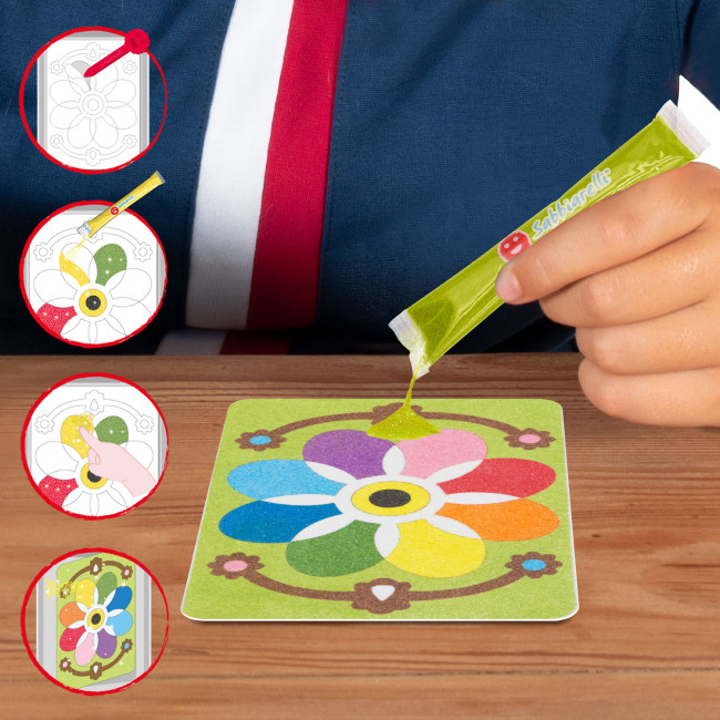- Le bustine hanno un’apertura facilitata che permette di dosare la sabbia quando si colora, rendendo il gioco facile.