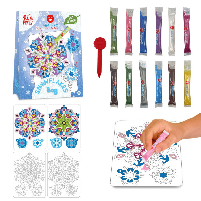 Sabbiarelli presenta le nuovissime Bag Sabbiarelli, i mini kit di sandpainting con 12 bustine di sabbia colorata e tanti soggetti diversi da colorare con la tecnica del sand painting. Ogni bag contiene 2 disegni adesivi, uno spellicolino e 12 bustine di sabbia scintillante.