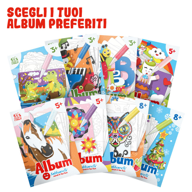 I bambini con Sabbiarelli sperimentano un’esperienza di gioco particolarmente premiante perché possono realizzare in autonomia dei bellissimi lavoretti artistici. La manipolazione della sabbia nella colorazione dei disegni, altrimenti detta pittura materica, permette ai bambini di agire direttamente sul disegno, senza l'uso di altri strumenti che non siano le loro dita, rendendo l’esperienza di gioco con i Sabbiarelli unica. La natura materica della sabbia permette di realizzare opere fortemente tattili, rese ancora più speciali dal tipo di sabbia utilizzata, la brillantissima sabbia del marmo bianco di Carrara, in tante varianti di colore dalla grande energia cromatica. Grazie alle speciali penne Sabbiarelli, colorare con la sabbia è un'azione alla portata di tutti: i piccoli artisti possono liberare la loro creatività nella colorazione, seguendo l'esempio colore o scegliendo nuove combinazioni o ancora creando nuove sfumatore di colore mischiando tra loro le sabbie, senza sprechi. 100% Made in Italy, in questa Box Sabbiarelli c’è tutta l’attenzione e la qualità che l’azienda dedica a ogni suo prodotto, senza mai perdere di vista l’obiettivo primario, e cioé il divertimento del bambino attraverso un gioco creativo ed educativo.