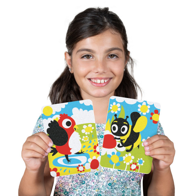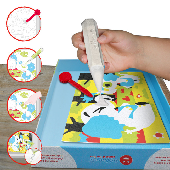 Grazie alle speciali penne Sabbiarelli, colorare con la sabbia è un'azione alla portata di tutti: i piccoli artisti possono liberare la loro creatività nella colorazione, seguendo l'esempio colore o scegliendo nuove combinazioni o ancora creando nuove sfumatore di colore mischiando tra loro le sabbie, senza sprechi.