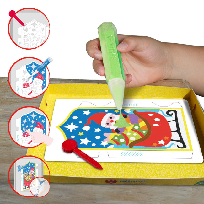 Grazie alle speciali penne Sabbiarelli, colorare con la sabbia è un'azione alla portata di tutti: i piccoli artisti possono liberare la loro creatività nella colorazione, seguendo l'esempio colore o scegliendo nuove combinazioni o ancora creando nuove sfumatore di colore mischiando tra loro le sabbie, senza sprechi.